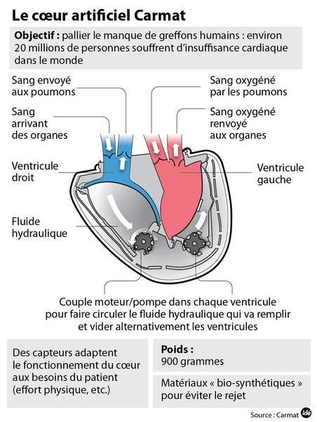 Plus récemment la société Carmat a développé le premier modèle de prothèse cardiaque complète, dont la première implantation sur un patient, qui a ensuite survécu 74 jours avec, a été très largement médiatisée. Ce coeur artificiel reproduit le coeur humain en modélisant la contraction du myocarde par un moteur hydraulique alimenté par des piles à combustible pesant un peu moins de 3 kg et portées par le patient à la ceinture.